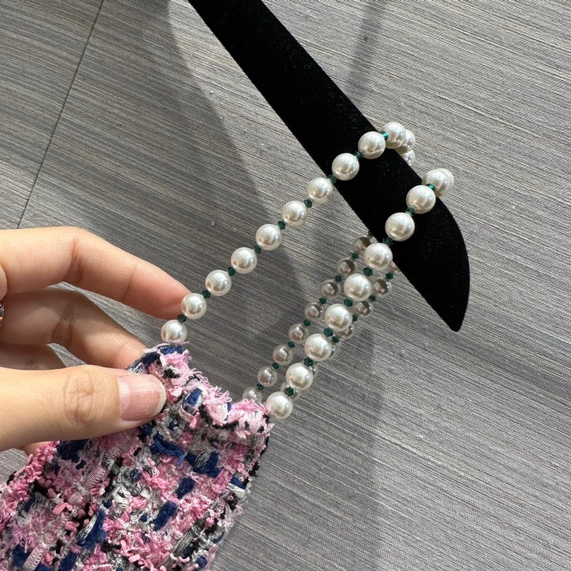Chan * l 23p agency purchase of popular products! Pearl strap dress! White, rich, and beautiful must enter the high-end colored yarn, pink, and blue woven soft tweed fabric, which is super beautiful! The pearl shoulder strap with green crystal color scheme is incredibly beautiful! French court style, elegant and luxurious luxury item essential for famous ladies! Overweight craft Handmade Pearl Shoulder Strap! The original development fabric has a 3D three-dimensional cutting pattern that makes the upper body appear huge and thin. The counter features a molded glass drop oil gradient blue green metal buckle, with an original 100% silk camellia jacquard lining. Perfect workmanship quality depends on details. Color 3. Throw over the big order