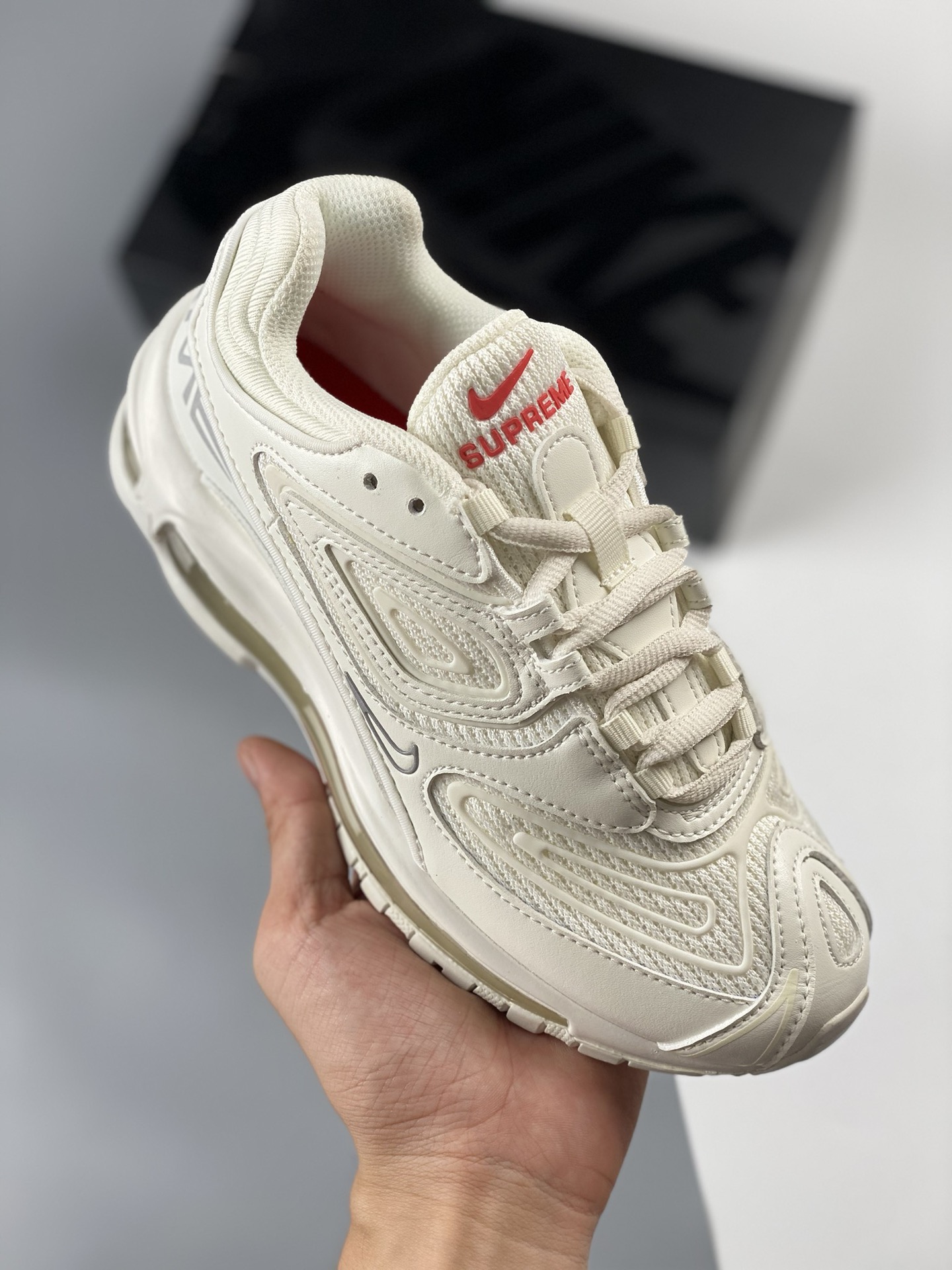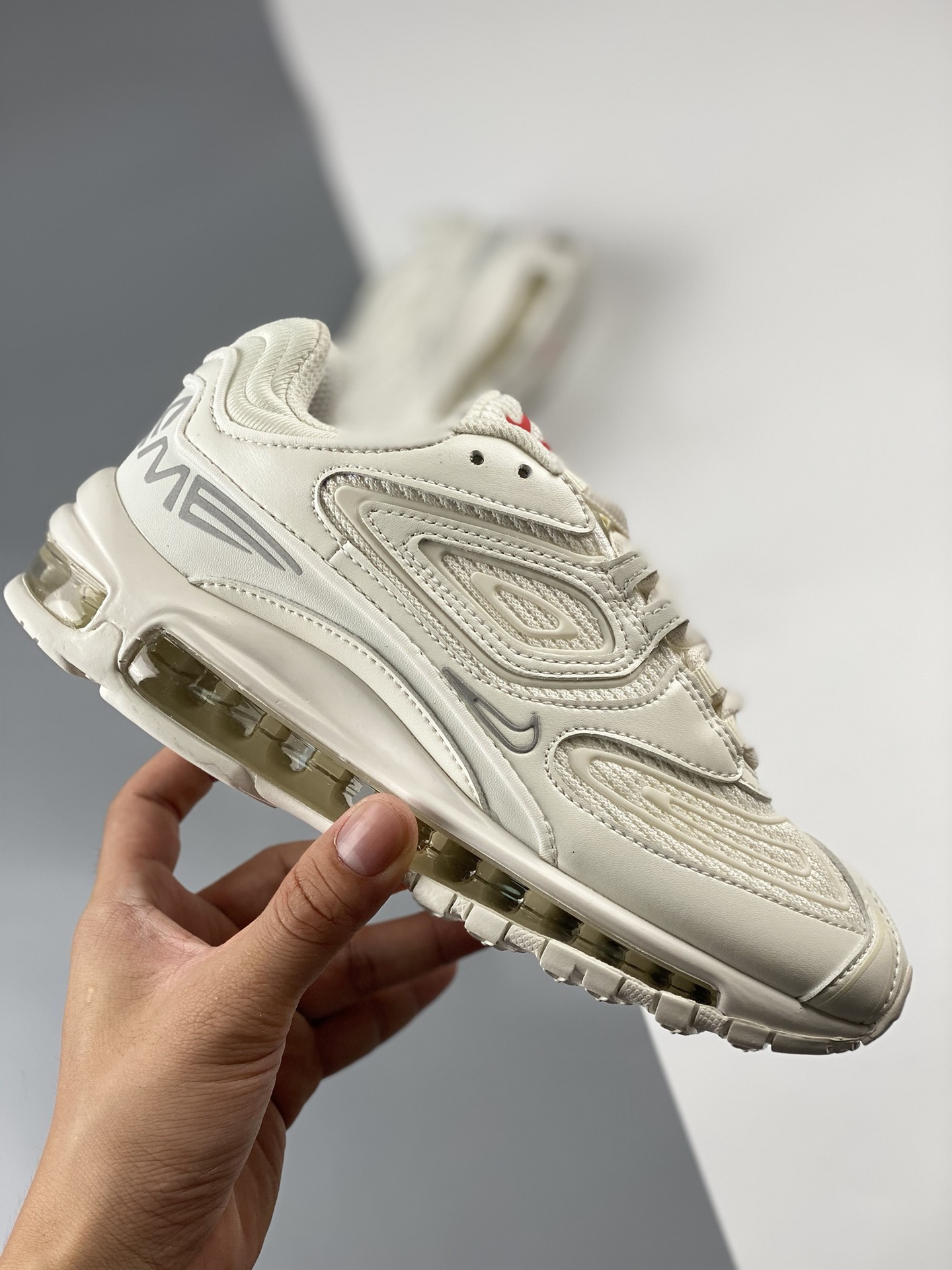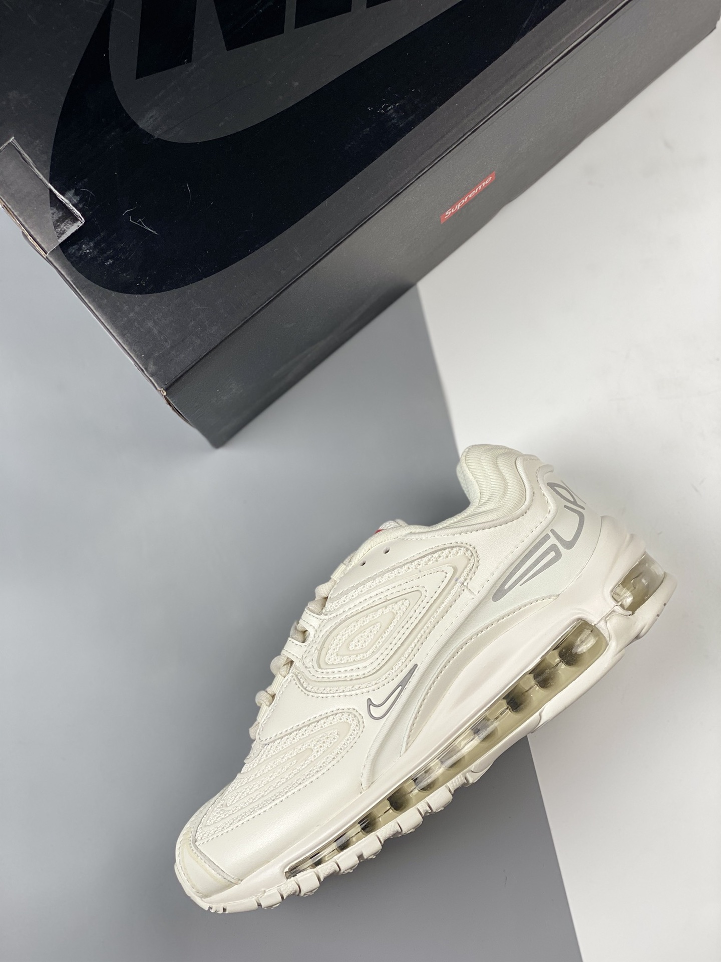 Nike Max 98 Full length Air Cushion Men's Shoe Casual Jogging Shoe Pure White Supreme x Nike Air Maxtl Co branded Upper is made of leather and mesh materials, equipped with a replacement full length Airmax Air Cushion commonly found on Air Max97. The 3m reflective TPU overlay and the "supreme" brand with the "tlair" logo on the heel have completed the design. They will come with co branded tags, insoles, and packaging. Product number: dr1033-100 Size: 39 40 40.5 41 42 42.5 43 44 44.5 45